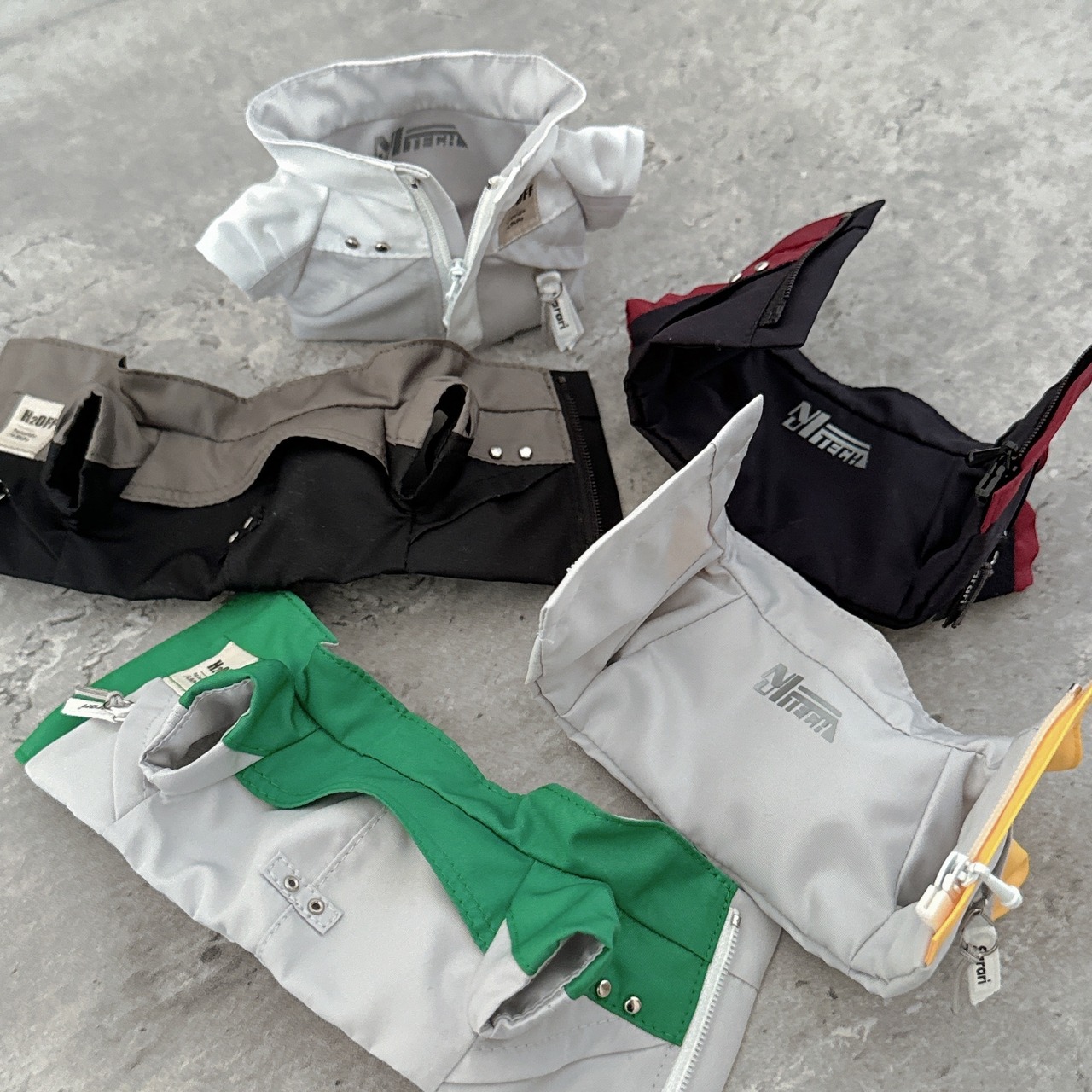 ※小さいファスナーを使用していますので閉めるのに少しコツが要ります。先に下方だけ閉めておき、襟元から穿かせるように着せてあげるとお着替えがスムーズです。