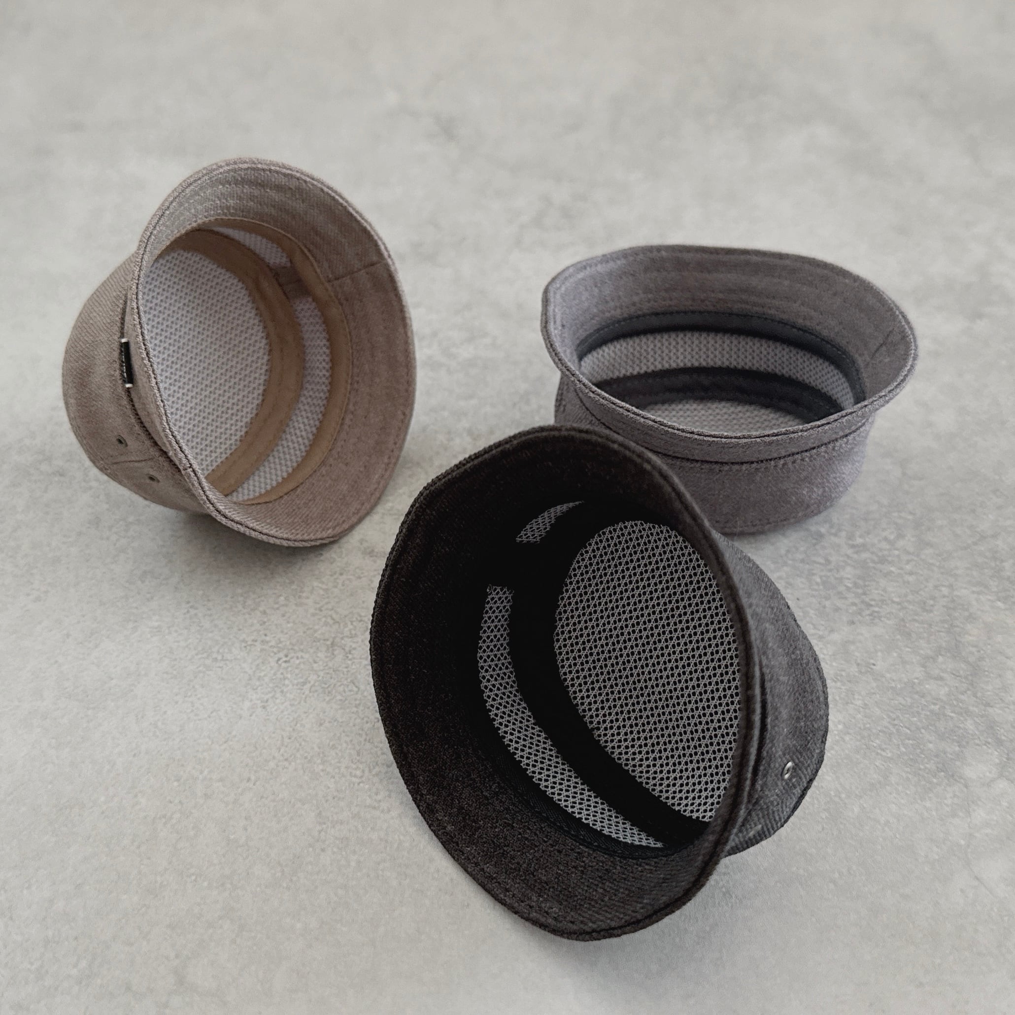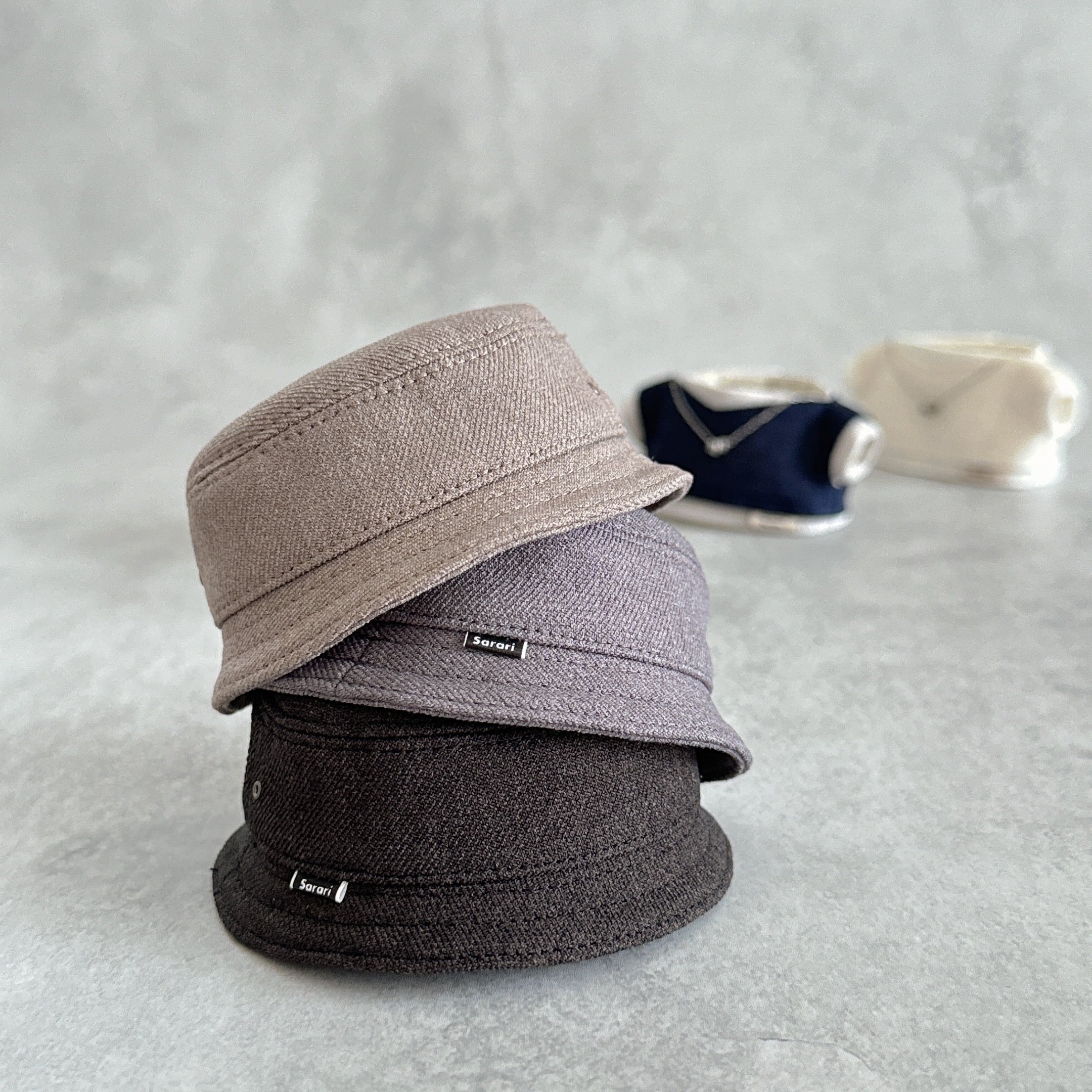 祖父のおさがりのような、どこか懐かしい雰囲気のバケットハット。トップを楕円型にし、ぬいさんの頭にフィットしやすい形にしました。ハリがありつつ、くたっと感もある生地感で、サイドにハトメとタグが付いています。前後はお好みでかぶせてあげてください。